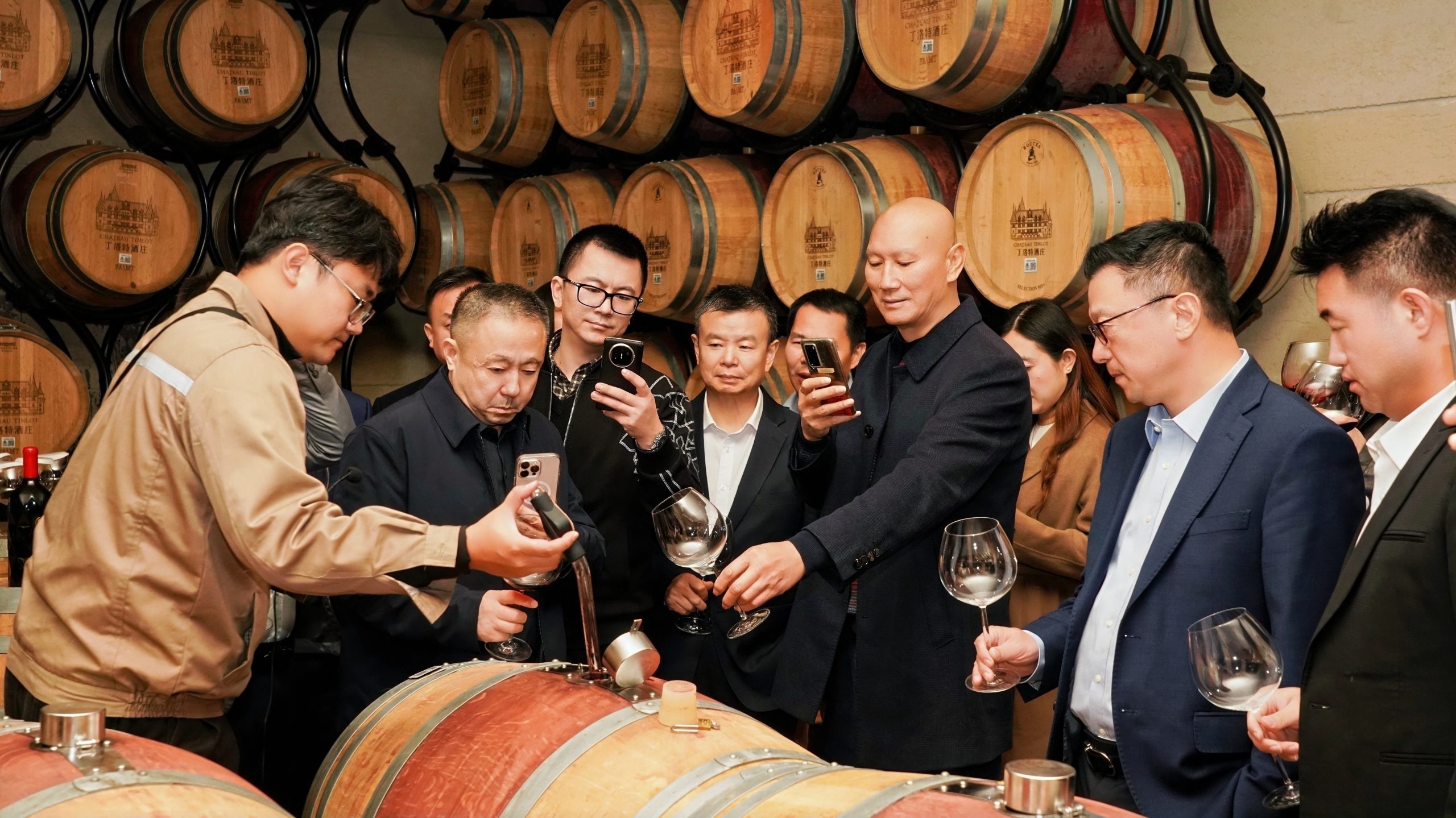 在丁洛特酒庄的静谧酒窖内,代表团体验了极具仪式感的桶边品鉴。酿酒师从橡木桶中直接取酒,嘉宾真切感受了葡萄酒在陈酿过程中演化出的丰富层次。