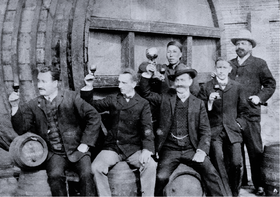 1914年,张裕首位酿酒师巴保(第二排右一)、张裕首任总经理张成卿(第二排左一)与众多酿酒师举杯庆祝中国第一桶白兰地诞生。