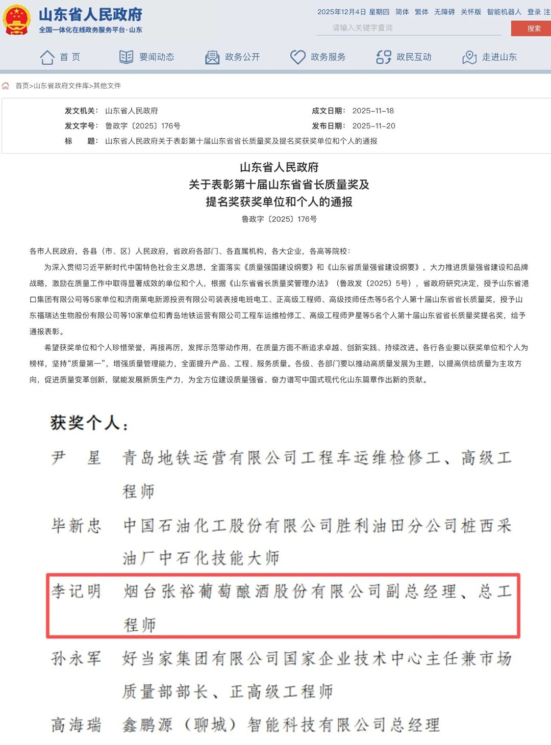 近日,首届中国酿酒大师、张裕股份副总经理、总工程师李记明博士荣获第十届山东省省长质量奖个人提名奖,成为本届烟台市唯一获奖者。这是他继2023年入选山东省首席质量官典型,以及荣获“山东省泰山产业领军人才”后,再获肯定。