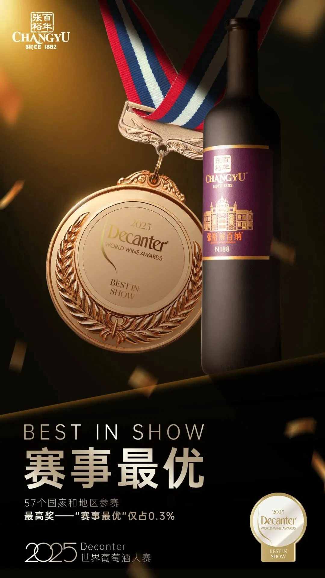 今年5月,张裕解百纳N188获得Decanter世界葡萄酒大赛的最高奖项——“赛事最优(Best in Show)”。这是自2016年大赛设立“赛事最优”为最高奖项以来,中国葡萄酒首次获此殊荣(改版前最高奖项为“国际奖”,International Trophy*)。